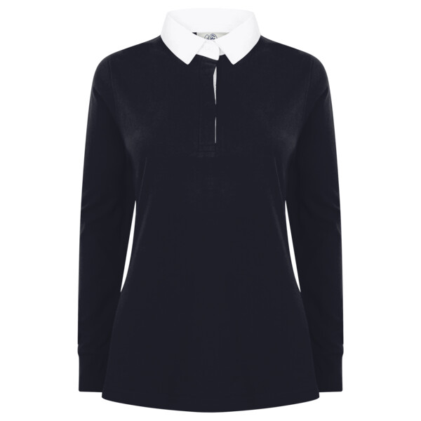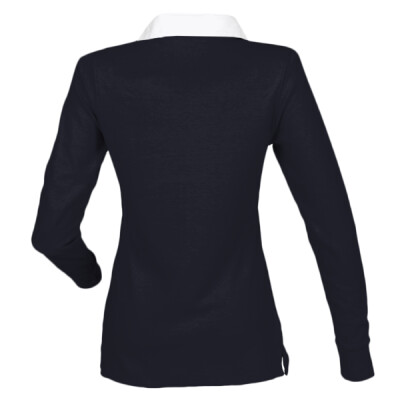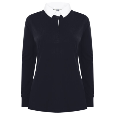 Self fabric taped side vents. Elastane reinforced cuffs for shape retention. Twin needle hems and traditional rugby collar. Slimmer feminine fit. Dyed to match plastic buttons. WRAP Certification.