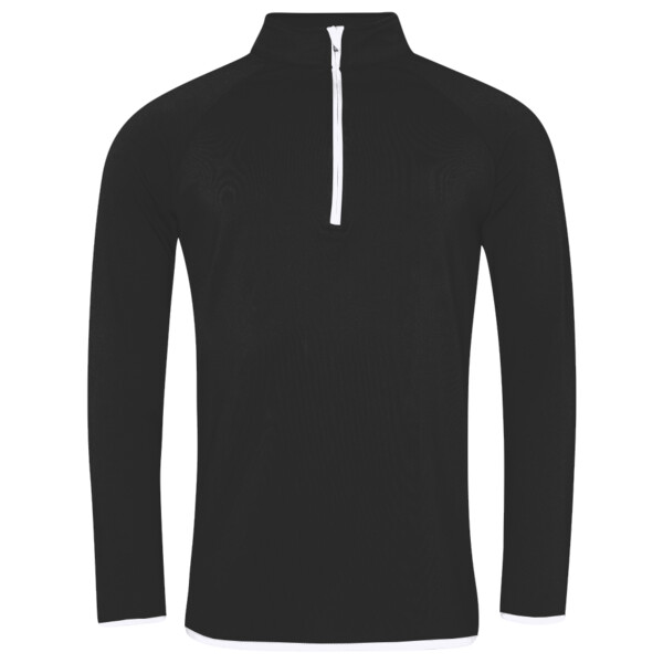 AWDis' own CoolFit blended fabric containing elastane that provides stretch for comfort and a great fit, tight fit, reflective tab on back of neck helps keep ear phone cords in place, self-fabric contrast colour binding at zip, cuffs and hem, raglan sleeve design creates ease of movement, ½ zip with stand-up collar for warmth, chin guard prevents irritation, simple tear off label makes it perfect for rebranding, UPF 30+ UV protection.