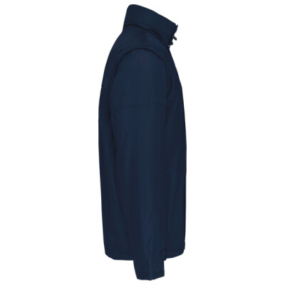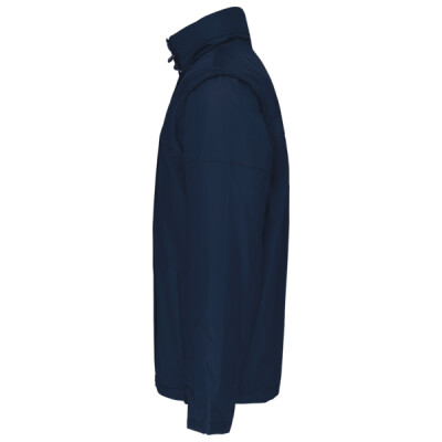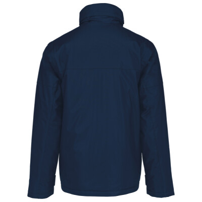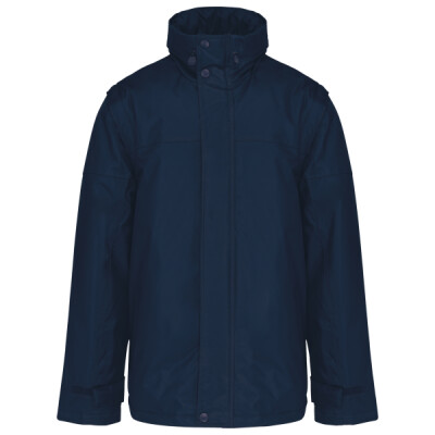 Full length front zip and buttoned placket with snap fasteners. Tightening tab with Velcro at cuffs. Inside collar hood with zip and drawcord with stopper. Tightening drawcord at bottom hem with stopper. Inside zip for easier personalisation.