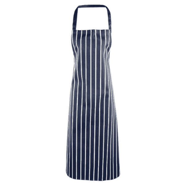 Printed "Butchers" style stripes, self fabric neckband, self-fabric 90cm ties. Width 72cm, length from waist 71cm, total length 101cm. Size One Size