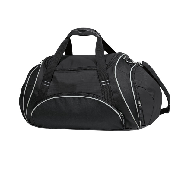 This go-to travel and workout bag delivers bold colours, plenty of room and an athletic design that fits inside most gym lockers. Large main compartment. Side shoe pocket. Adjustable, padded shoulder strap. Plastic moulded interlocking handle. Front-faced zipper pocket. Side storage pocket. All metal hardware. SIZE 13" x 24" x 12"