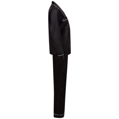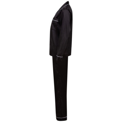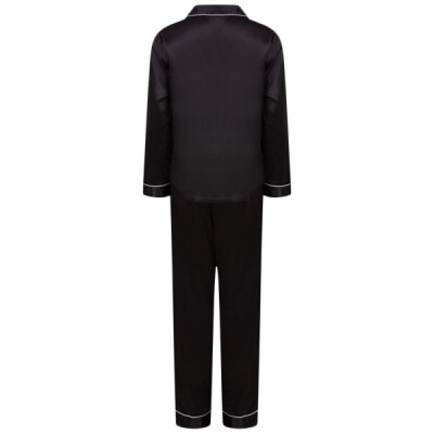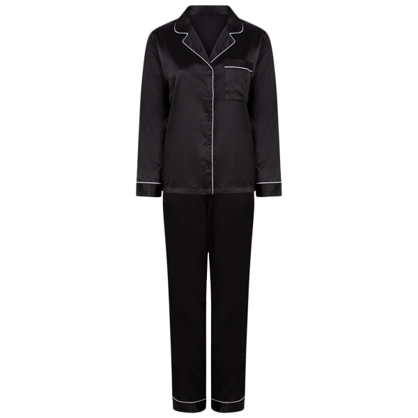 Stretch satin long sleeved shirt and long pants pyjama set. Centre front button fastening down the centre front. Front breast pocket. Contrast piping detail. Pants with elasticated waistband and self fabric drawcord.