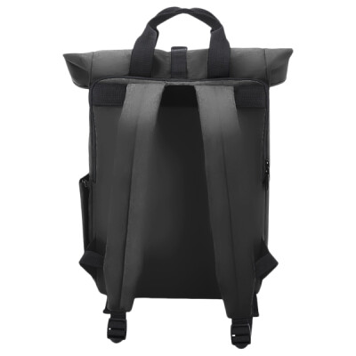 Contains 100% certified recycled polyester. External access secure padded laptop compartment. Laptop compatible up to 15.6". Zipped internal pocket. Front pocket organiser section. Front pocket designed for easy decoration. External bottle pocket. Padded back panel. Roll-top closure. Padded adjustable shoulder straps. Webbing carry handles. TearAway label for ease of rebranding.
