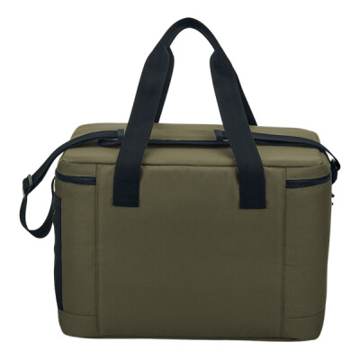 100% Recycled 600D polyester. PVC-free. PEVA lining – BPA-free. Food-safe, fully insulated main compartment. Zipped main compartment. Zipped front pocket. Stretch mesh side pocket. Wipe-clean interior. Internal water bottle/ice block holders. Twin carry handles. Cord zip pulls with reflective detailing. Adjustable webbing shoulder strap. TearAway label for easy rebranding.