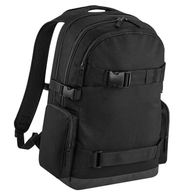 TearAway label for ease of rebranding. Laptop compatible up to 17". External access padded laptop compartment. Skateboard carry straps. Internal organiser section. Zippered front pocket. Zippered side pockets. Padded back panel. Compression straps. Padded adjustable shoulder straps. Grab handle.