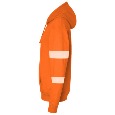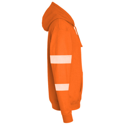 100% brushed back polyester fabric soft touch – 310gsm. Certified EN ISO 20471:2013 +A1:2016 Class 2. Heat-applied reflective tape, with segmented tape on strategic panels for additional comfort. Grown-on hood with adjusters. Kangaroo pocket to front. Ribbed collar and cuffs. ID reflection – angled chevrons identify which way you are facing. Made with recycled content.